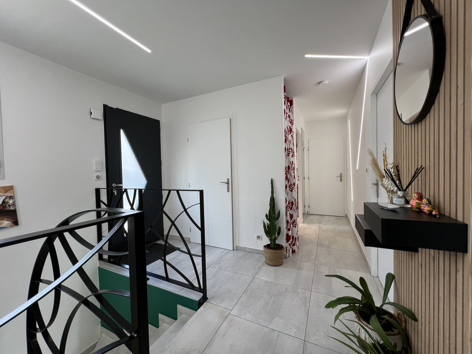 Au niveau bas : Un grand espace de 52 m2 salon séjour salle à manger cuisine US avec son ilot central entièrement équipée ouvrant sur terrasse et jardin d'agrément , et une suite parentale comprenant chambre salle d'eau wc, un espace buanderie cave. Un beau jardin plat attenant arboré. Propriété construcion de 2018 équipee d'une pompe à chaleur assurant la partie chauffage et la production d'eau chaude sanitaire et climatisation reversible.Disponible rapidement