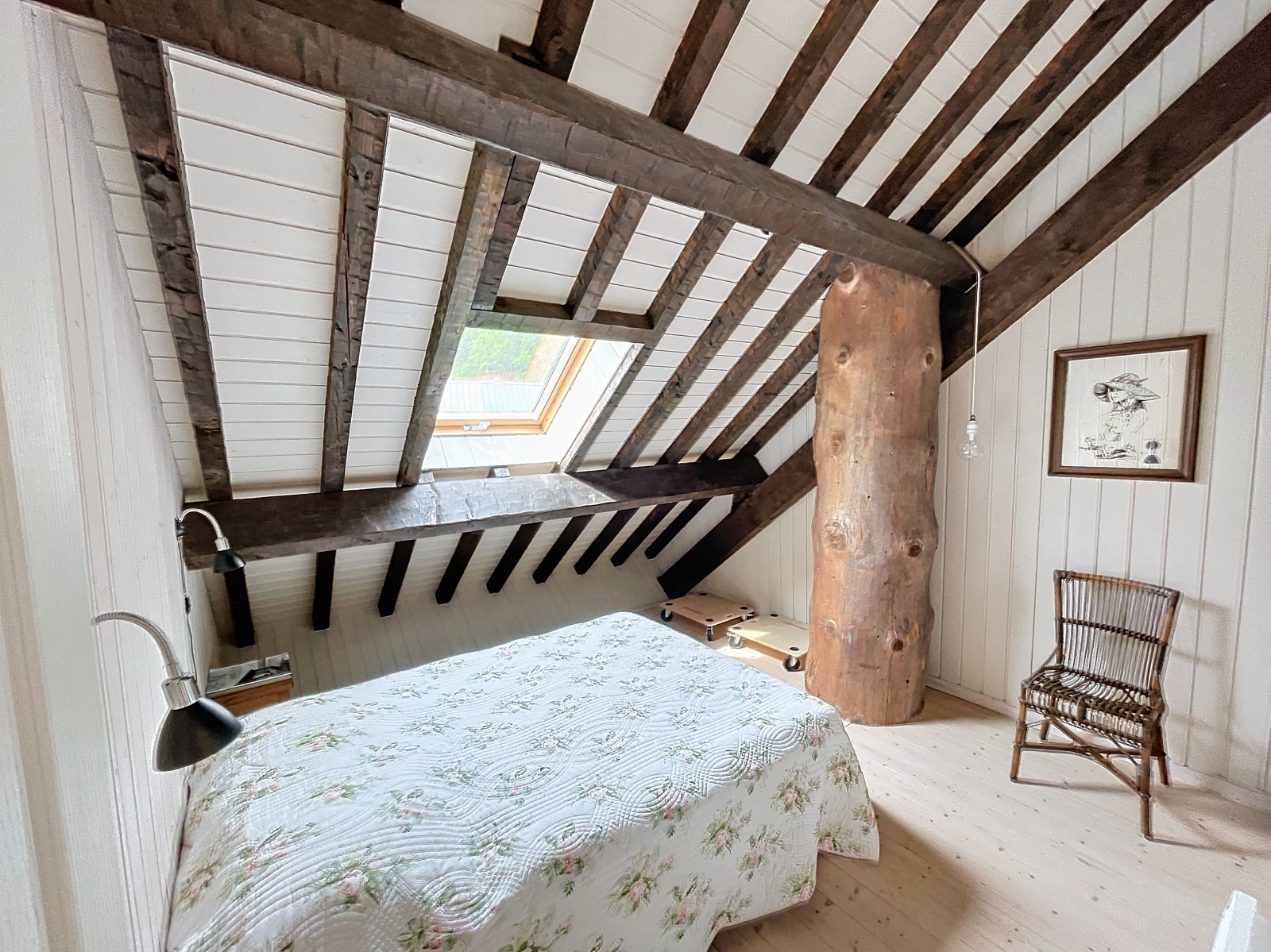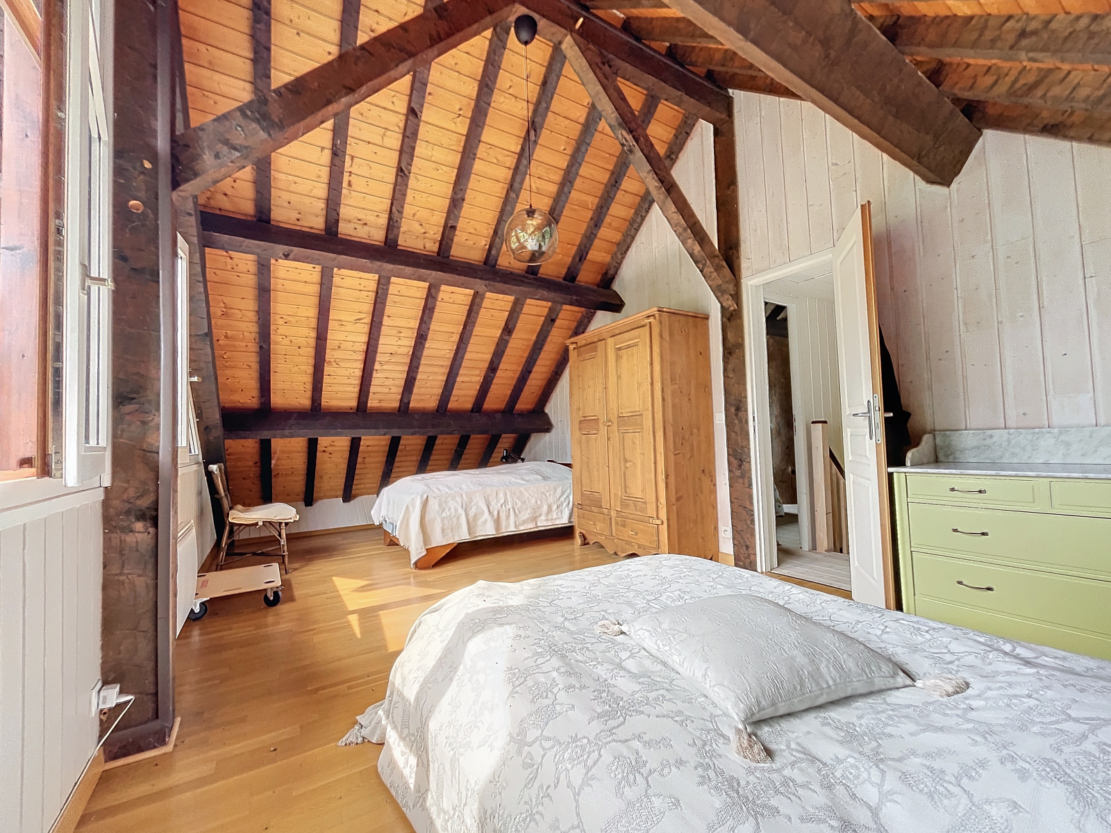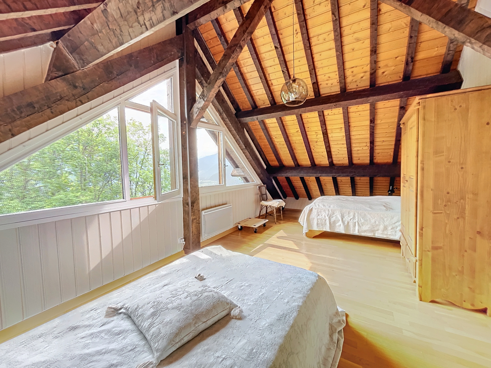 Chalet de 133 m2 en superficie développée comprenant un rez-de-chaussée et deux niveaux. Il se compose d'une entrée directe sur un espace voûté servant de salle de jeux confortable de 36 m2, un garage, un sas vestiaire et cage d'escaliers desservant à l'étage une grande pièce de vie avec un grand séjour-salle à manger très lumineux et un coin salon avec cheminée de 51,44m2 ouvrant sur un grand balcon d'angle et terrasse sud-ouest offrant une vue dégagée sur le bas de vallée, un coin cuisine équipé et une salle d'eau avec wc. Au niveau combles amménagées vous trouverez trois belles chambres en partie mansardées avec des puits de lumière type velux. Chauffage électrique par convecteurs et cheminée bois.