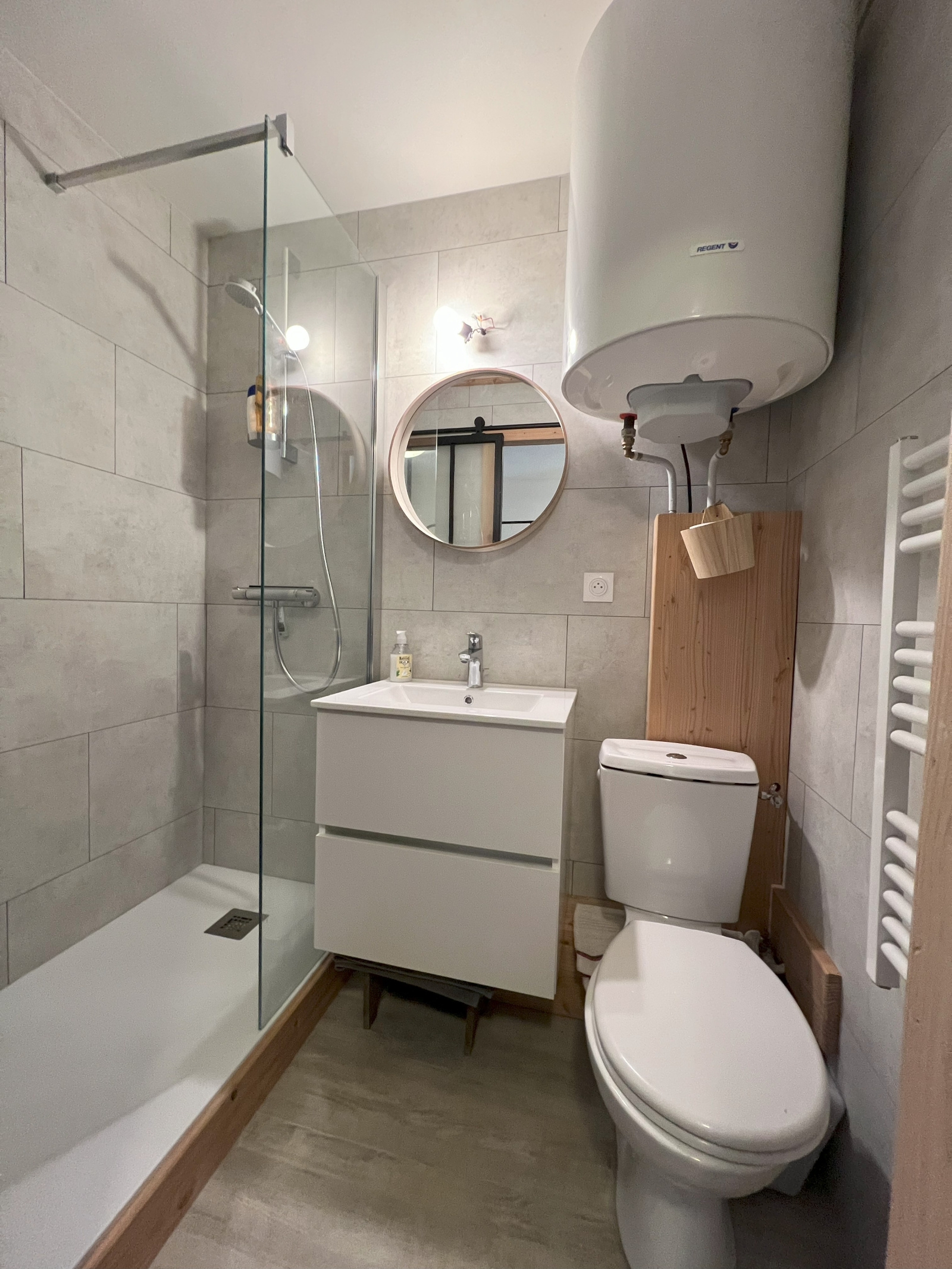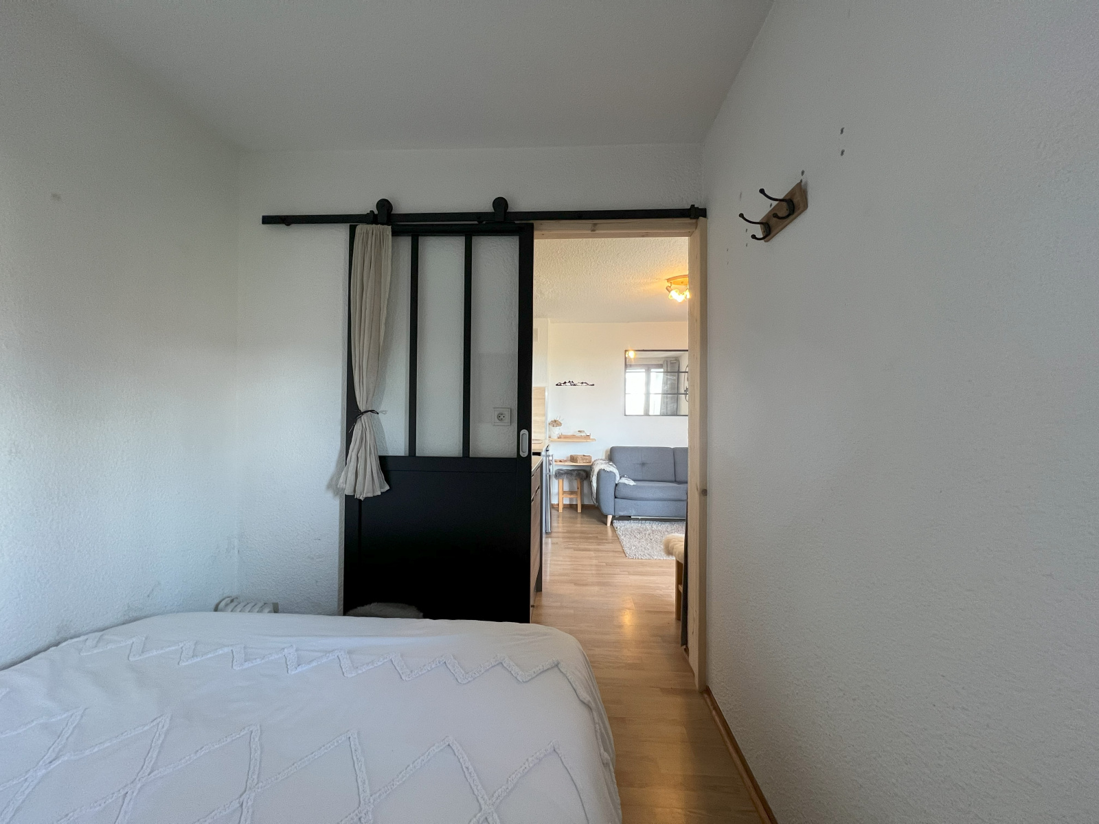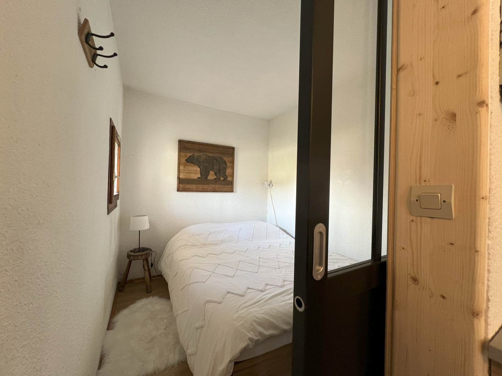 Cet appartement meublé en RDC comprend: Une entrée avec coin montagne, un séjour salle à manger ouvrant sur terrasse, une chambre avec lit double, une salle d'eau avec wc.
